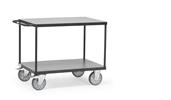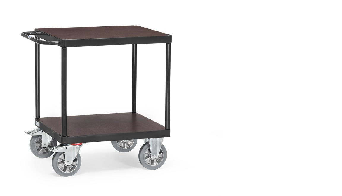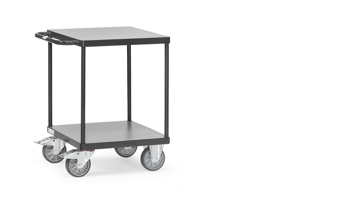 Het nieuwe programma in de trendkleur antracietgrijs RAL 7016, met houtvezelplaten in middengrijs. Zware tafelwagens met een draagkracht tot 1200 kg.