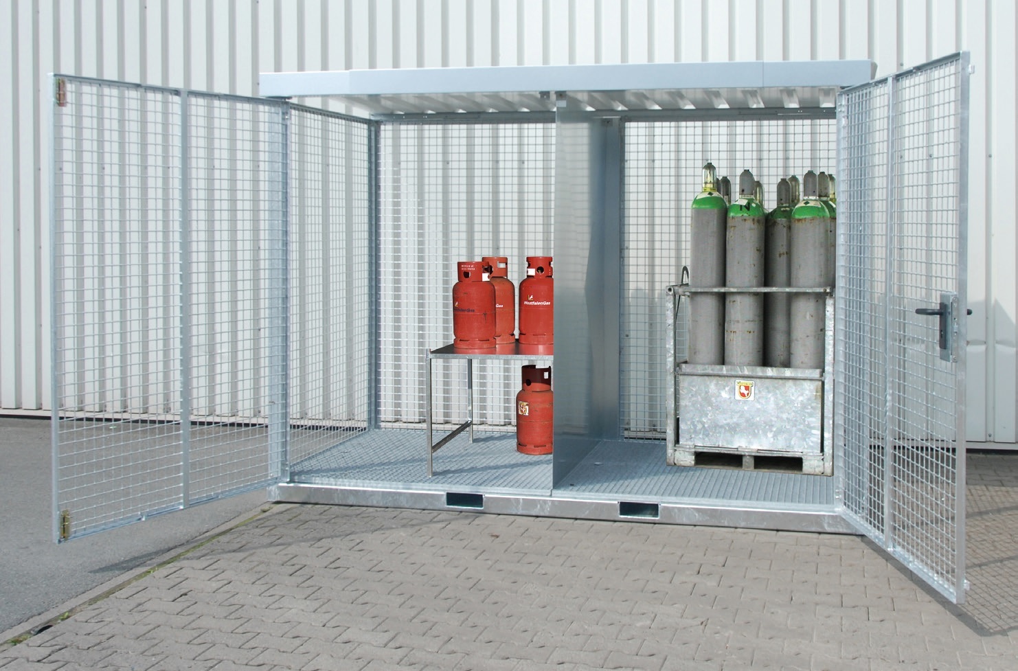 Gaaskooi voor de opslag van gasflessen voor buiten volgens TRGS 510. Stabiele frameconstructie met dak en bodem. Afsluitbare vleugeldeur. Inrijdkokers voor de opname met een vorkheftruck. Compleet gemonteerd. Voorzien van een traanplaatbodem 1000 kg/ m².