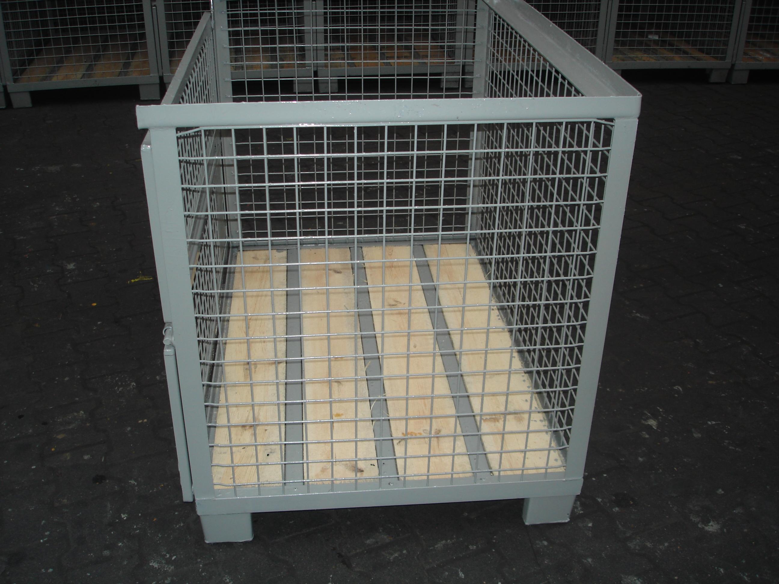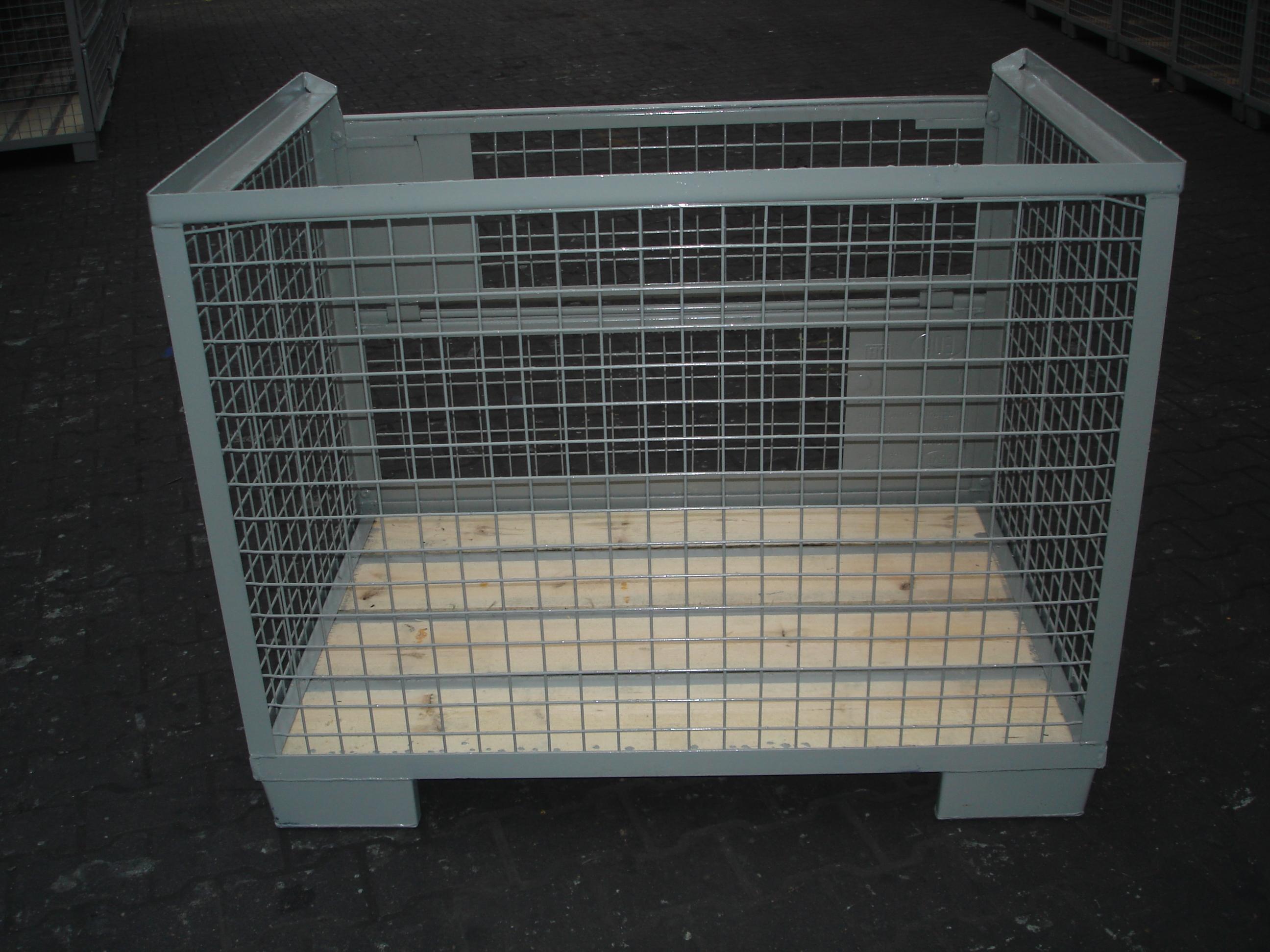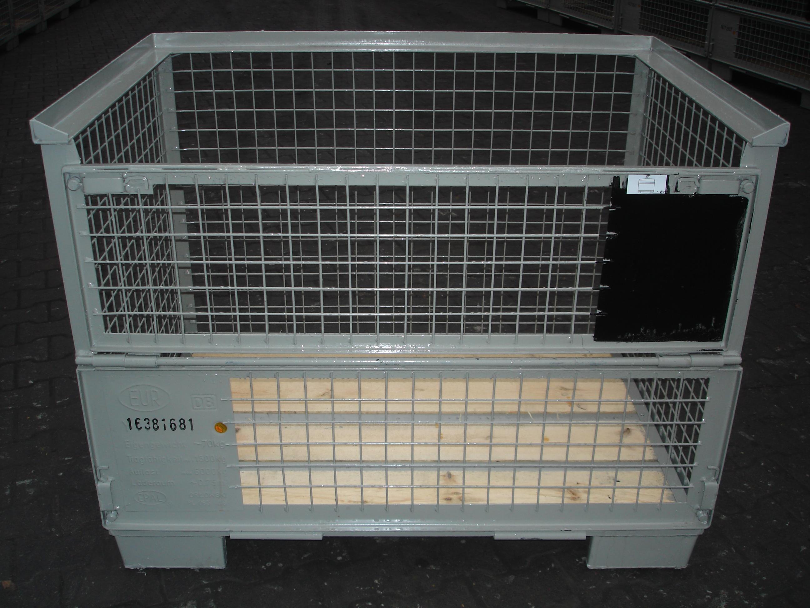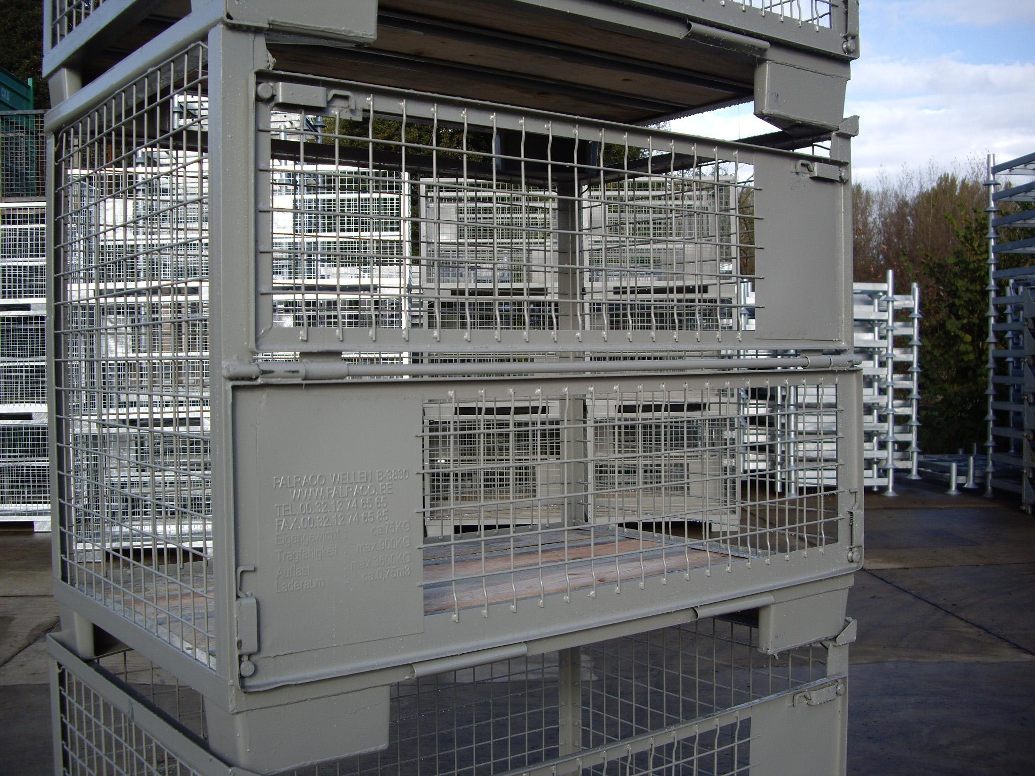 De "PALRACO- uitvoering" heeft 1 wand neerklapbaar. Onder en bovenframe van deze gaasbox is uit hoekprofiel. De bodem is van 2 mm geprofileerde staalplaat, met daartussen houten planken. De wanden zijn uit gaaspanelen van 50*50*4 mm. Naar wens kan steeds de bodem nog extra versterkt worden en de constructie van de wanden aangepast. De "echte" europool gitterbox naar DIN norm 15155/ 8 en volgens UIC 435-3. Vier hoog stapelbaar bij een draagvermogen van 1500 kg. Eén langezijde ( voorkant) voorzien van 2 kleppen ( 1 naar boven en één naar beneden) met treksluiting. Stapelvoeten uit kokerprofiel en stapelframe boven uit L-profiel. Houten vloer ondersteund door stalen omega profielen. Gaaswanden uit gaas 50*50*4 mm. Uitgevoerd met 2 merkplaten, waarvan 1 zwart. Grijs gelakt RAL 7030.