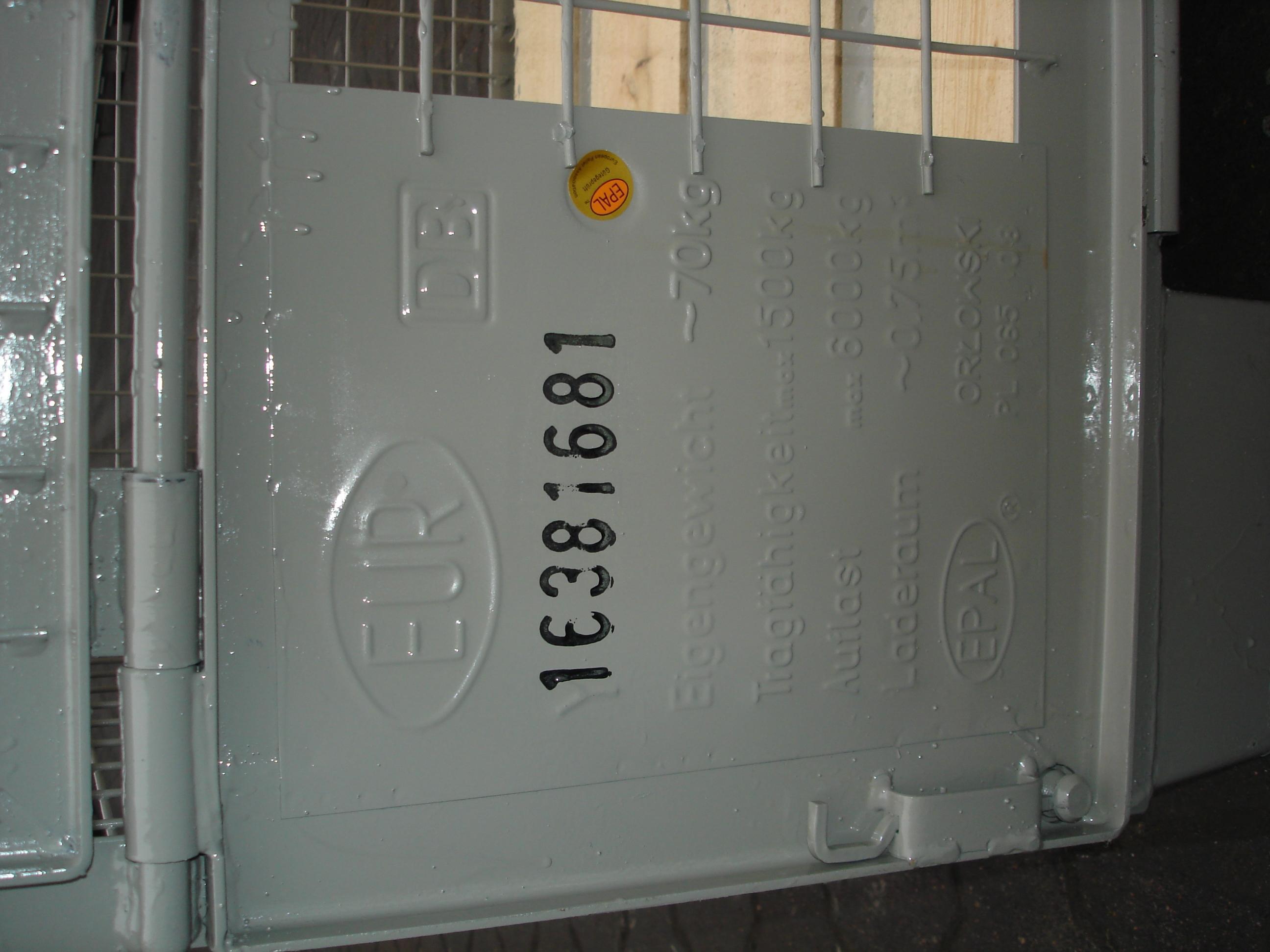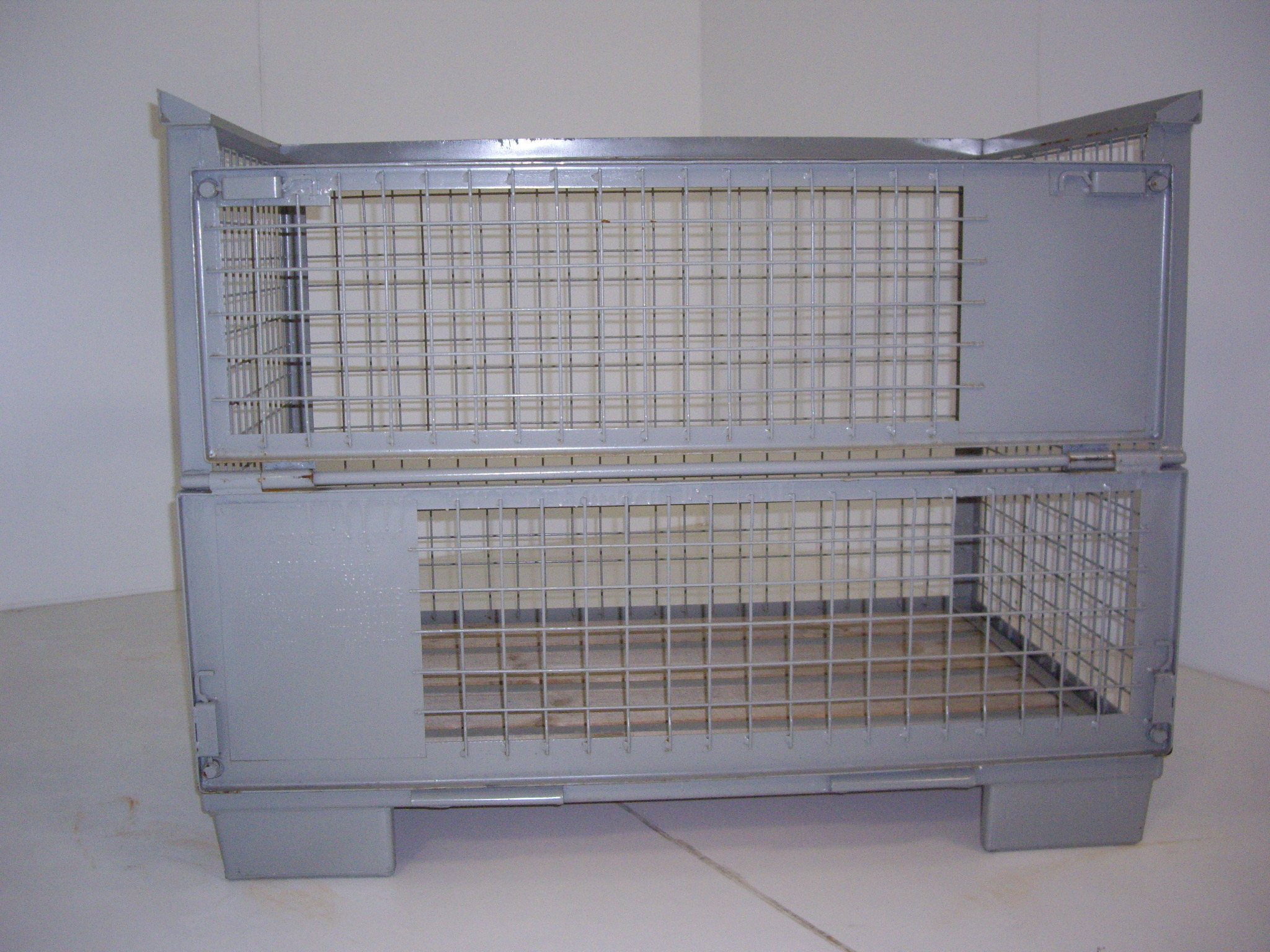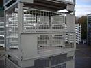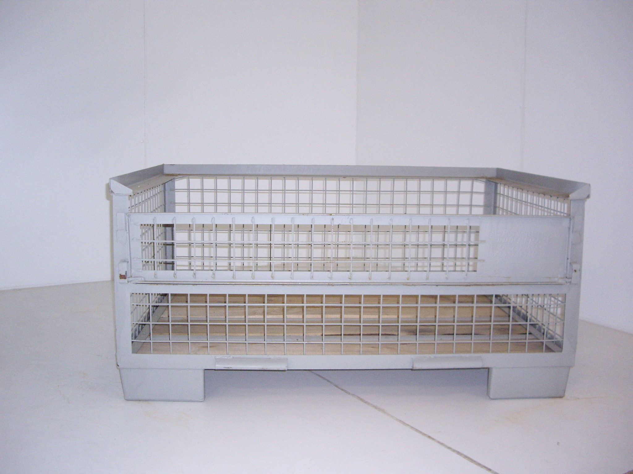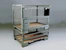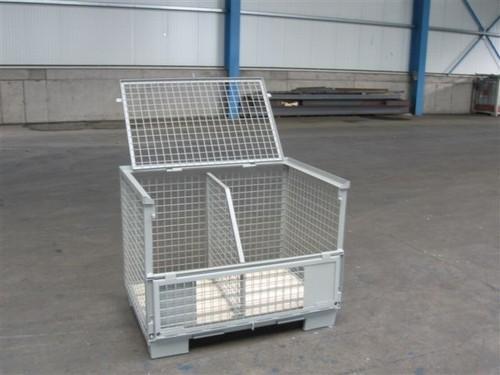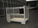 De "PALRACO- uitvoering" heeft 1 wand neerklapbaar. Onder en bovenframe van deze gaasbox is uit hoekprofiel. De bodem is van 2 mm geprofileerde staalplaat, met daartussen houten planken. De wanden zijn uit gaaspanelen van 50*50*4 mm. Naar wens kan steeds de bodem nog extra versterkt worden en de constructie van de wanden aangepast. De "echte" europool gitterbox naar DIN norm 15155/ 8 en volgens UIC 435-3. Vier hoog stapelbaar bij een draagvermogen van 1500 kg. Eén langezijde ( voorkant) voorzien van 2 kleppen ( 1 naar boven en één naar beneden) met treksluiting. Stapelvoeten uit kokerprofiel en stapelframe boven uit L-profiel. Houten vloer ondersteund door stalen omega profielen. Gaaswanden uit gaas 50*50*4 mm. Uitgevoerd met 2 merkplaten, waarvan 1 zwart. Grijs gelakt RAL 7030.