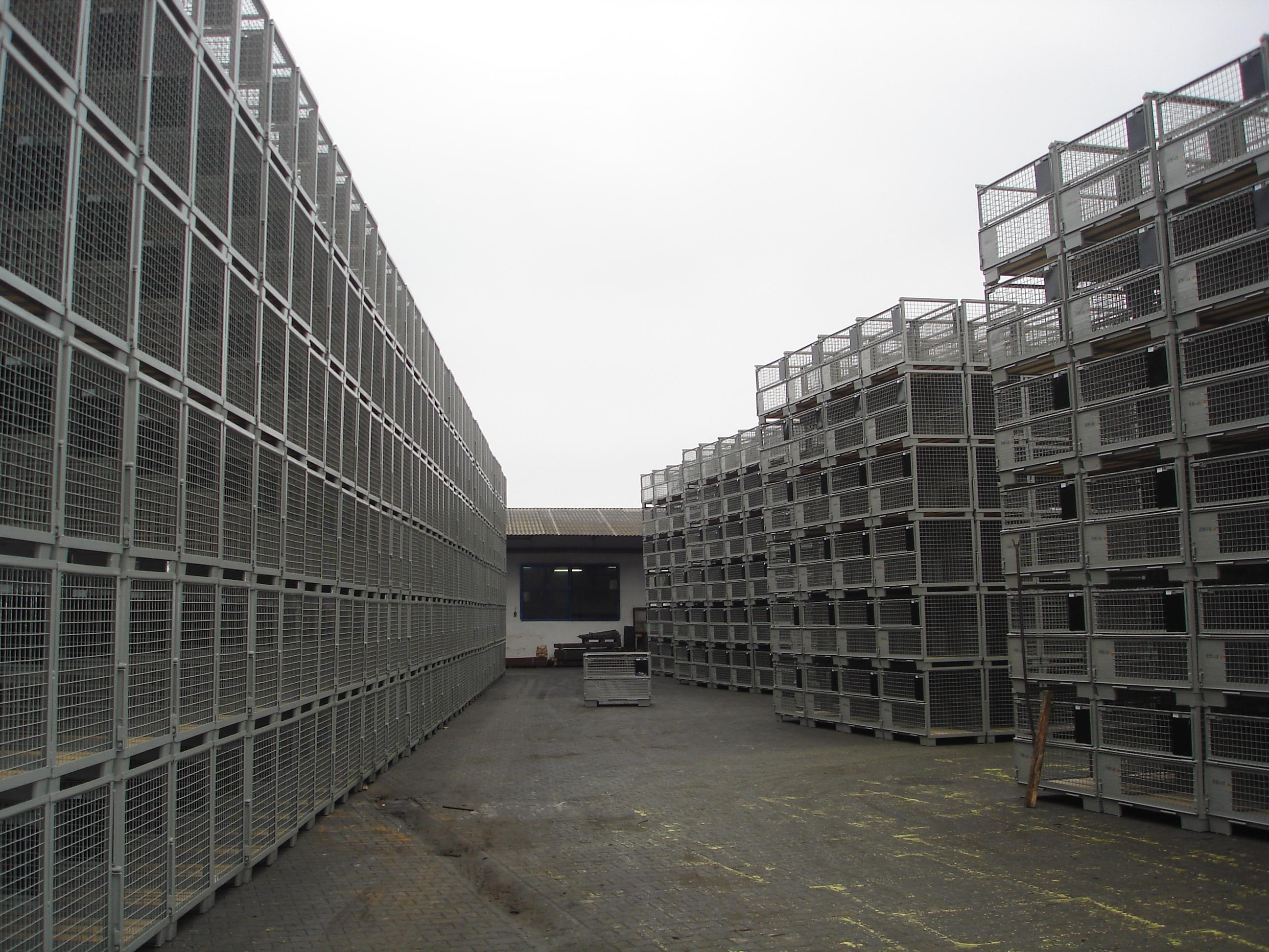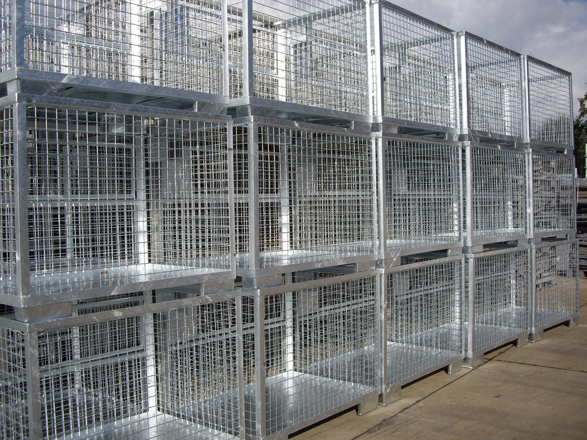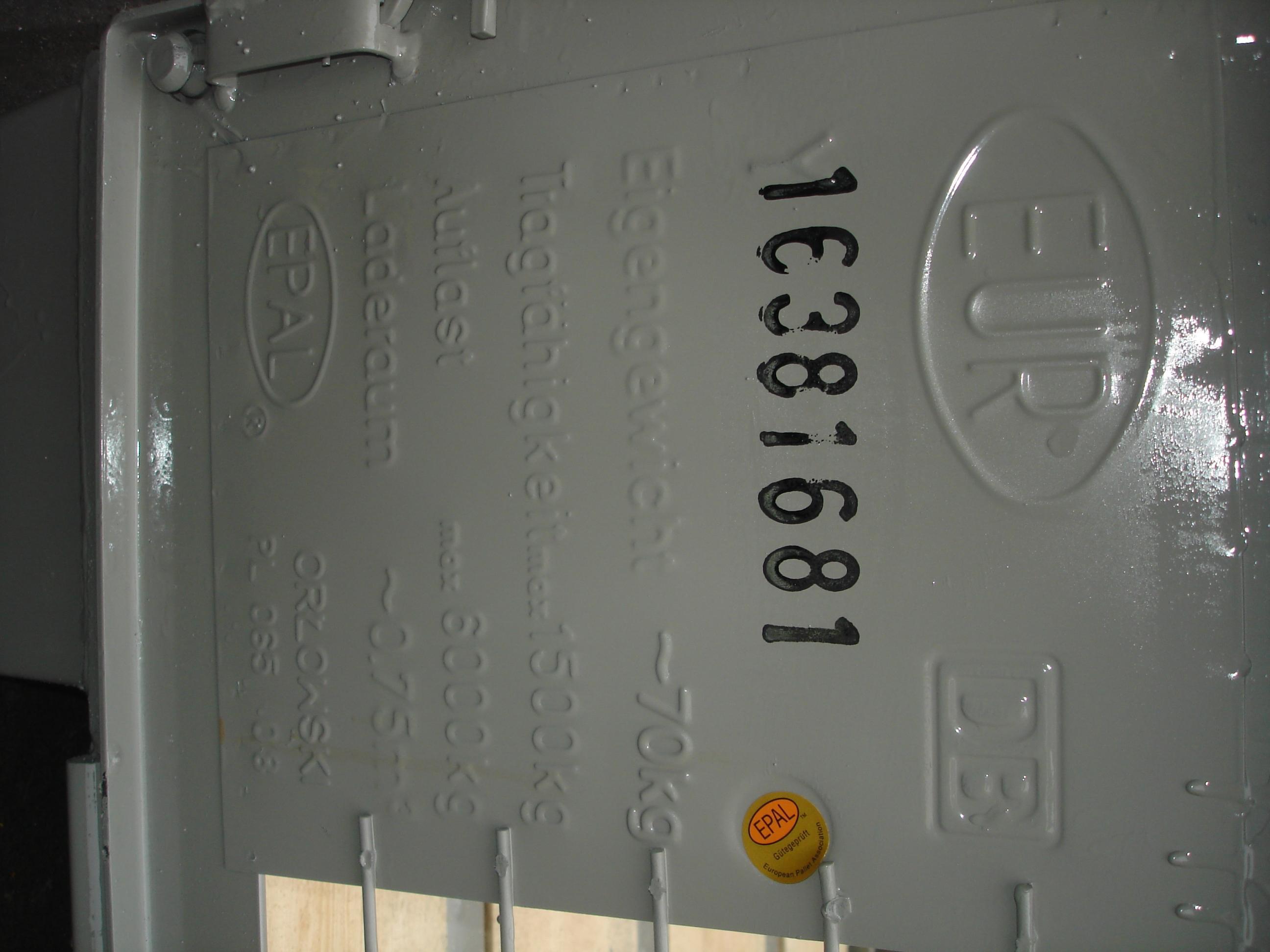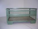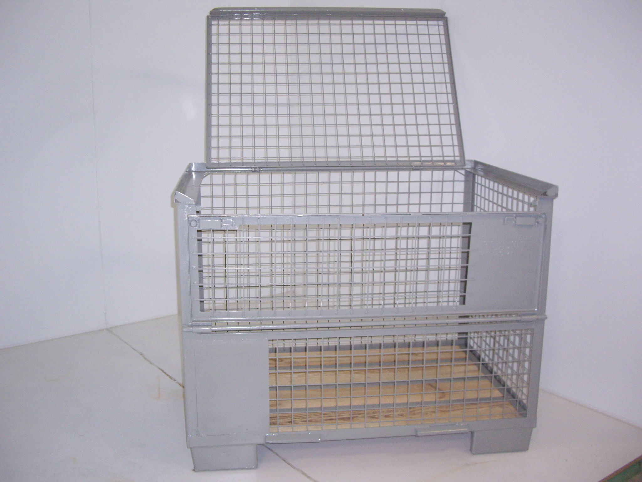 De "PALRACO- uitvoering" heeft 1 wand neerklapbaar. Onder en bovenframe van deze gaasbox is uit hoekprofiel. De bodem is van 2 mm geprofileerde staalplaat, met daartussen houten planken. De wanden zijn uit gaaspanelen van 50*50*4 mm. Naar wens kan steeds de bodem nog extra versterkt worden en de constructie van de wanden aangepast. De "echte" europool gitterbox naar DIN norm 15155/ 8 en volgens UIC 435-3. Vier hoog stapelbaar bij een draagvermogen van 1500 kg. Eén langezijde ( voorkant) voorzien van 2 kleppen ( 1 naar boven en één naar beneden) met treksluiting. Stapelvoeten uit kokerprofiel en stapelframe boven uit L-profiel. Houten vloer ondersteund door stalen omega profielen. Gaaswanden uit gaas 50*50*4 mm. Uitgevoerd met 2 merkplaten, waarvan 1 zwart. Grijs gelakt RAL 7030.
