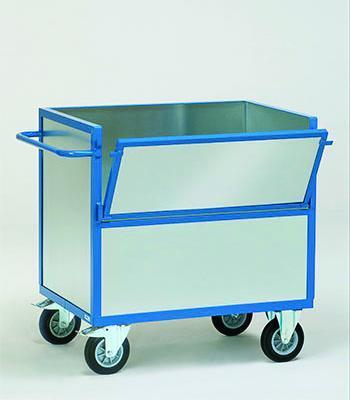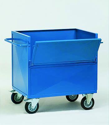 Stalen buis en gelast profielstaal, poedercoating blauw RAL 5007. Laadvlak verzinkt of van staalplaat,  afgewerkt met poedercoating. Twee zwenk- en  2 bokwielen van massief rubber,  naaf met rollager. Zwenkwielen met rem.  Uitvoering met  of zonder deksel.