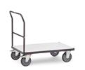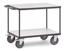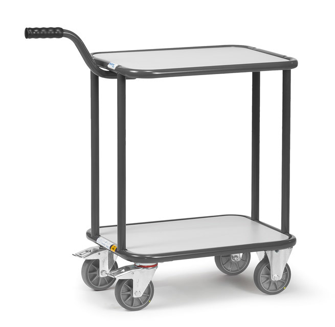 Electrostatisch geleidende uitvoering. Opgebouwd uit stalen buis en profielstaal, gelast electrostatische poedercoating grijs RAL 7015. Insteek- en schroefcontructie. Legborden van elektrisch geleidende houtvezelplaat. 2 zwenk- en bokwilen, wielen van TPE-ESD rubber (thermoplastisch elastomeer), elektrostatisch geleidend. 2 zwenkwielen met rem.