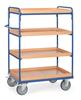Etagewagens vervaardigd uit een  multifunctioneel bouwsysteem met het reeds bewezen insteek en schroefsysteem. De etagewagens kunnen in een  handomdraai opgebouwd en gewijzigd worden. Profielstaal- staalplaatconstructie,  gepoedercoated in blauw RAL 5007. Kopwanden  open of met  verticale  buizen, waardoor materialen er niet door kunnen  vallen. Voorzien  van een  duwbeugel die aan beide  zijden  vast te schroeven is. Etages van sandwichplaten  met een hoog draagvermogen,  kunststof toplaag in beukenstructuur. Twee zwenk- en 2 bokwielen van massief rubber,  naaf met rollager. Zwenkwielen met rem.  Uitvoering met  4 legborden waarvan  1 vast en  3 verstelbare etages in een raster van 100mm, met eventuele rand van  60 mm.