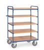 Etagewagens vervaardigd uit een multifunctioneel bouwsysteem met het reeds bewezen insteek en schroefsysteem. De etagewagens kunnen in een handomdraai opgebouwd en gewijzigd worden. Profielstaal- staalplaatconstructie, gepoedercoated in blauw RAL 5007. Kopwanden open of met verticale buizen, waardoor materialen er niet door kunnen vallen. Voorzien van een duwbeugel die aan beide zijden vast te schroeven is. Etages van sandwichplaten met een hoog draagvermogen, kunststof toplaag in beukenstructuur. Twee zwenk- en 2 bokwielen van massief rubber, naaf met rollager. Zwenkwielen met rem. Uitvoering met 5 legborden waarvan 1 vast en 4 verstelbare etages in een raster van 100mm.