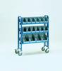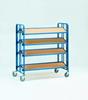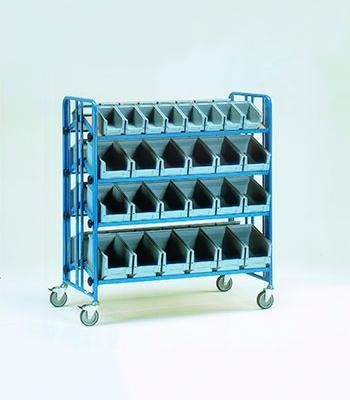 Bakken wagen met  of  zonder magazijnabakjes solide constructie, afgewerkt met poedercoating in kleur blauw, RAL 5007. Etages met randhoogte 12 mm, verstelbaar om de 100 mm en traploos te monteren onder een hoek van 0 tot 30 graden, vast te zetten d.m.v. sterknop. Wielen : 4 zwenkwielen mass. streeploos rubber 160 x 40 mm w.v. 2 wielen met rem.