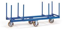 Langmateriaal-wagens: Gelaste profielstalen constructie met  insteekbare stalen rongen.  Poedercoating in  blauw RAL 5007.