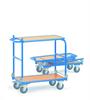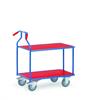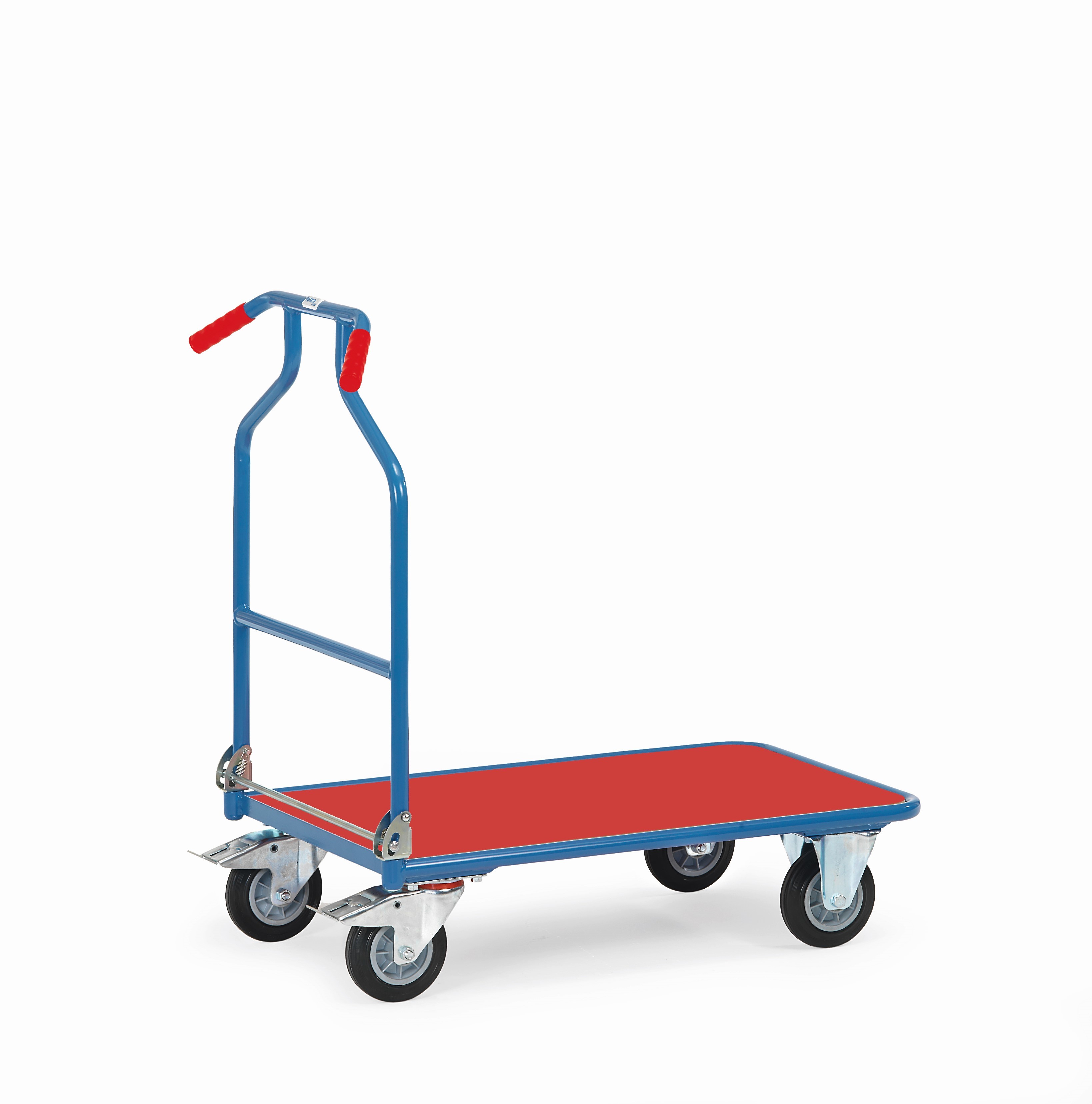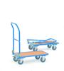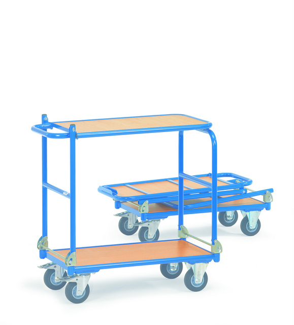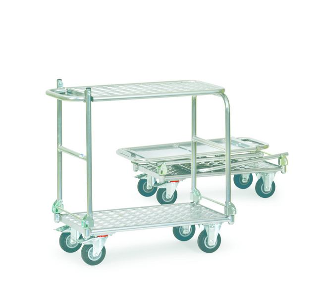 Opklapbare wagens, handzaam en plaatsbesparend, praktisch voor onderweg en eenvoudig op te bergen. Draagvermogen tot 250 kg. Stalen constructie met poedercoating in blauw RAL 5007. In het frame liggend houtvezelplaat, kunststof toplaag in beukenstructur of in aluminium met in het frame liggende alu- antisliplaat. Automatische duwbeugelblokkering, voorzien van 2 zwenk en 2 bokwielen. Zwenkwielen met rem.
