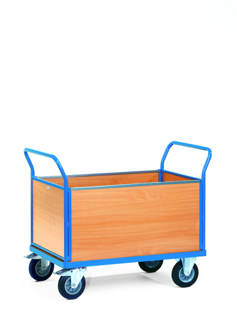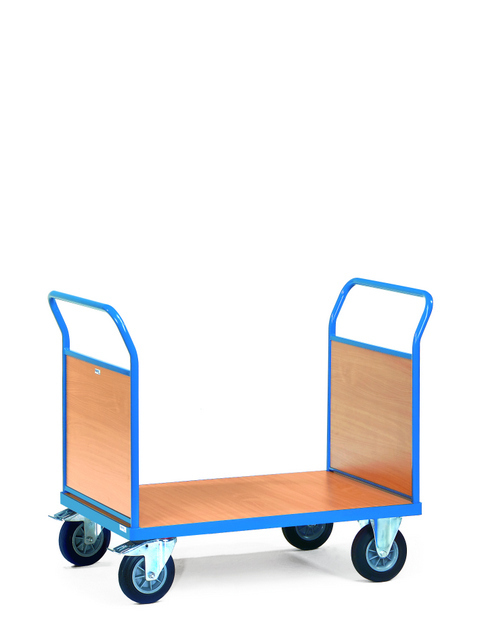 Platformwagens met één  of twee  gesloten duwbeugels en één of twee gesloten zijwanden. Kopwanden  van  houtvezelplaat, gefineerd met  kunststof toplaag in beukenstructuur. Wandhoogten: 500 mm. Afwerking in  poedercoating RAL 5007 Blauw.
