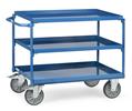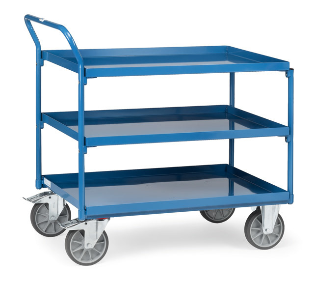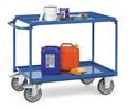 Tafelwagen, opgebouwd uit stalen buis en oliedichte staalplaat laadvlakken, schroefconstructie. Randhoogte 40mm. Poedercoating in kleur blauw RAL 5007. 2 zwenk-en bokwielen. Zwenkwielen met rem. Draagvermogen bovenste etage 200 kg. Alternatief met rand bovenste etage 150mm.