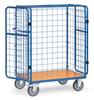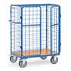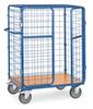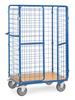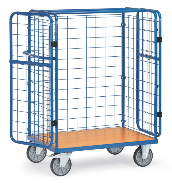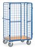 Pakketwagens met wanden van draadgaas. Stalen buis en gelast profielstaal, poedercoating blauw RAL 5007, schroefconstructie. Laadvlak van houtvezelplaat, toplaag in beukenstructuur. Kopwanden en één lange zijde van draadgaas 100 x 100 x 5 mm. Uitgevoerd met dubbele vleugeldeuren, met geïntegreerd grendelslot, afsluitbaar door hangslot. Wielen : mass. rubber 200 x 50 mm, 2 bok - en 2 zwenkwielen met rem.