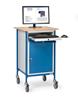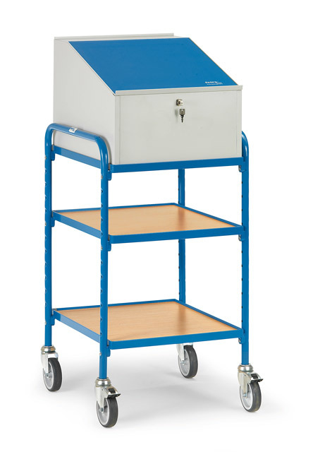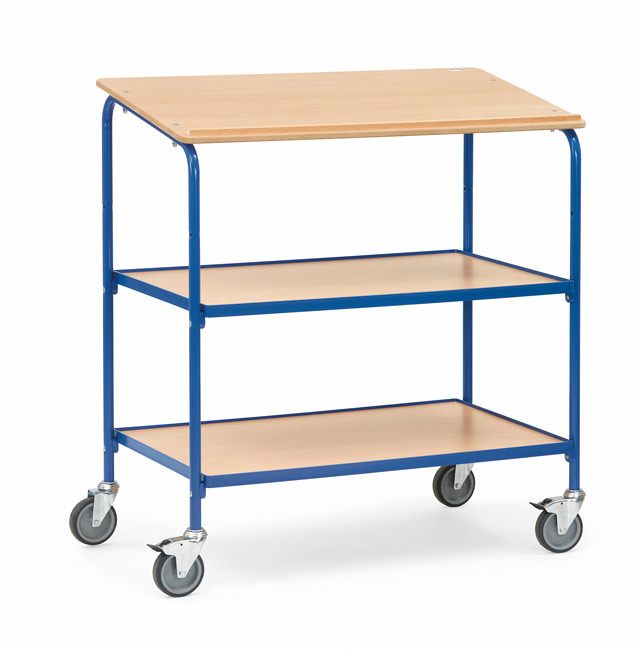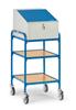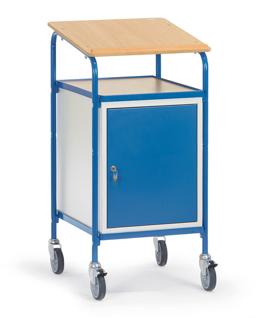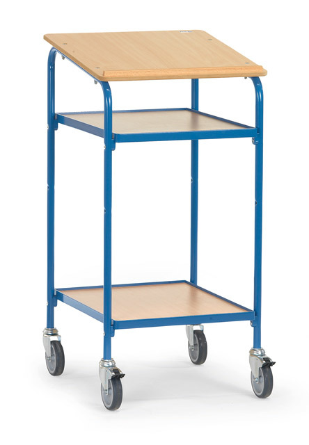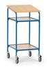 Verrijdbare lessenaars met constructie van stalen buis en gelast profielstaal, schroefconstructie. Afwerking met epoxy poedercoating kleur blauw RAL 5007. Met 4 zwenkwielen, 2 stuks met rem, naaf met glijlader. (Types 852449/852449 met 2 zwenk- en 2 bokwielen. zwenkwielen met rem.)