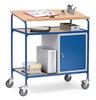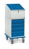 Schrijfbladen uit hout. Kasten epoxy grijs RAL 7035 met deuren in blauw RAL5007.