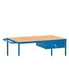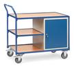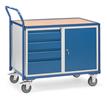 De constructie is opgebouwd uit stalen buis en gelast profielstaal. Gestraald, slag- en krasvast afgewerkt met poedercoating blauw RAL 5007. Kasten grijs RAL 7035 en deuren blauw RAL 5007. Laadvlakken van houtvezelplaat, gefineerd met kunststof toplaag in beukendecor. Liggend in een stalen frame. 2 Zwenk- en 2 bokwielen van massief rubber, naaf met rollager. Zwenkwielen met rem. Draagvermogen per lergbord (kast) 30 kg, per lade 25kg.