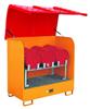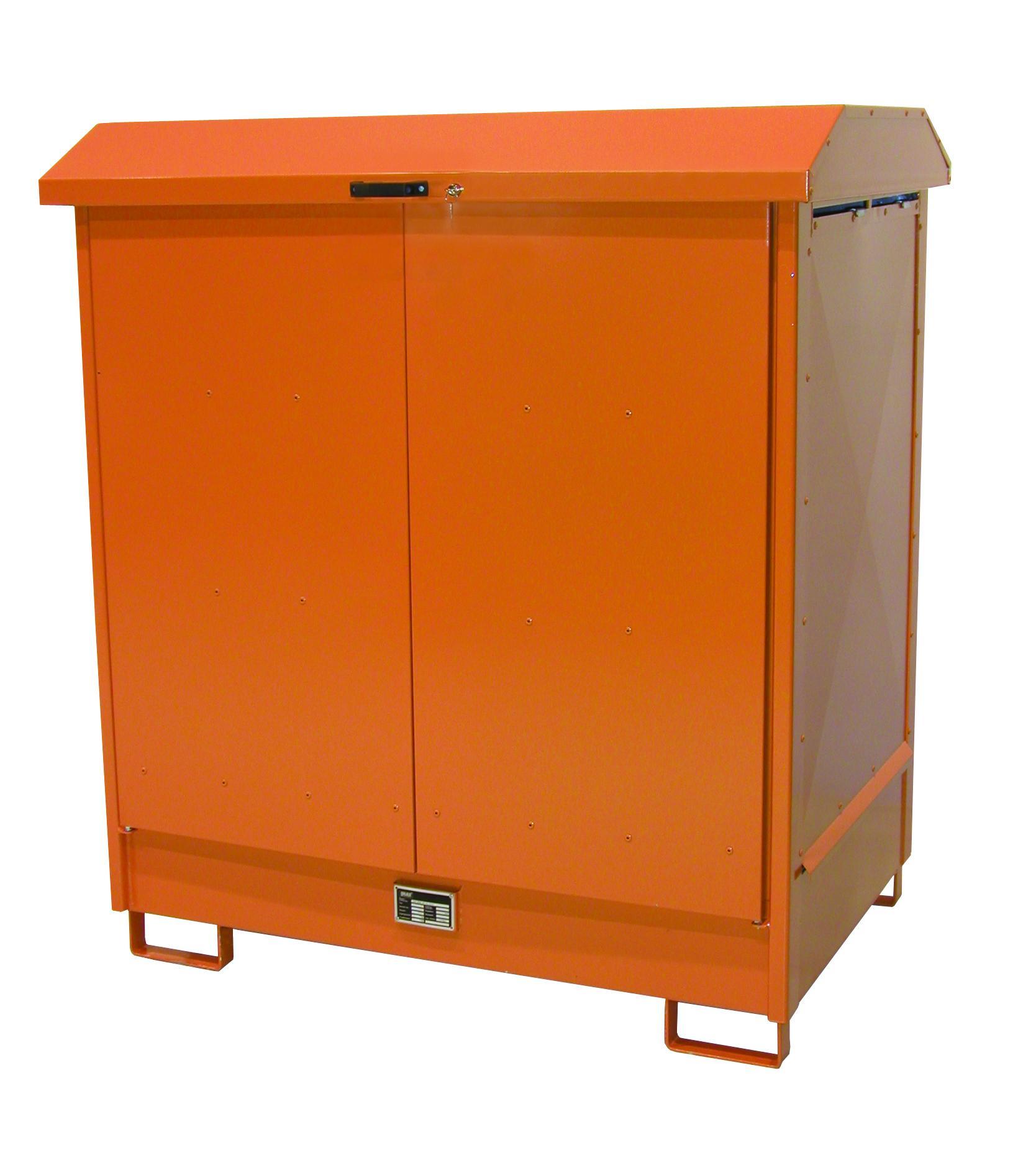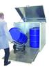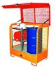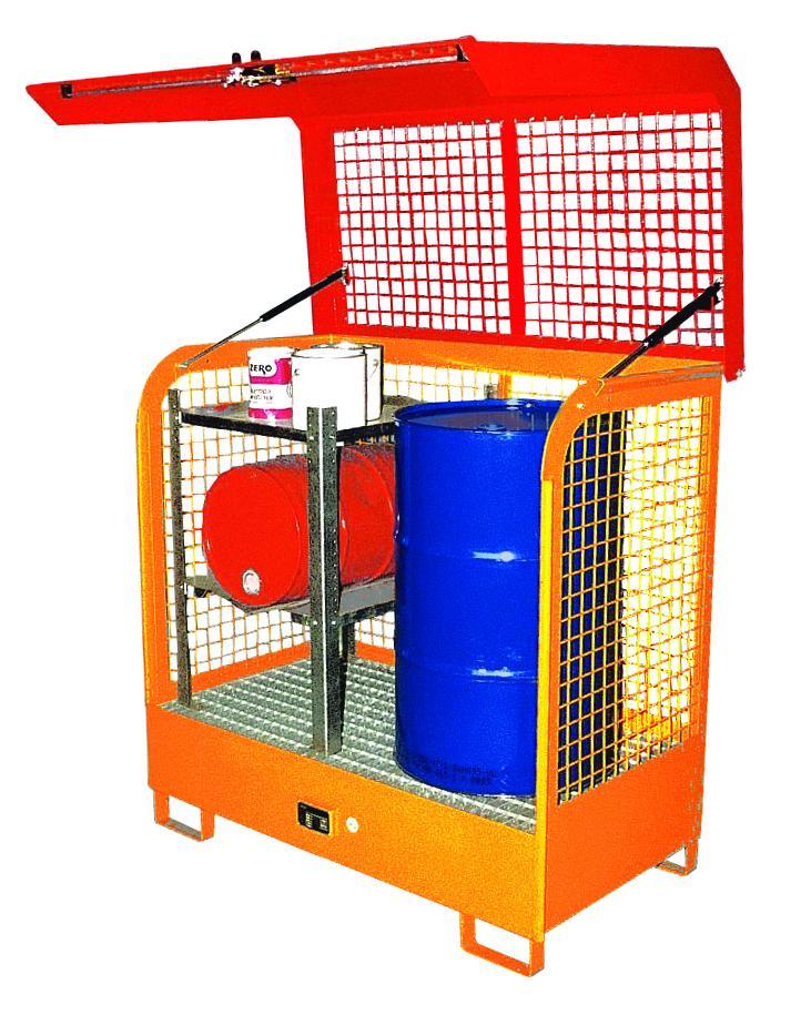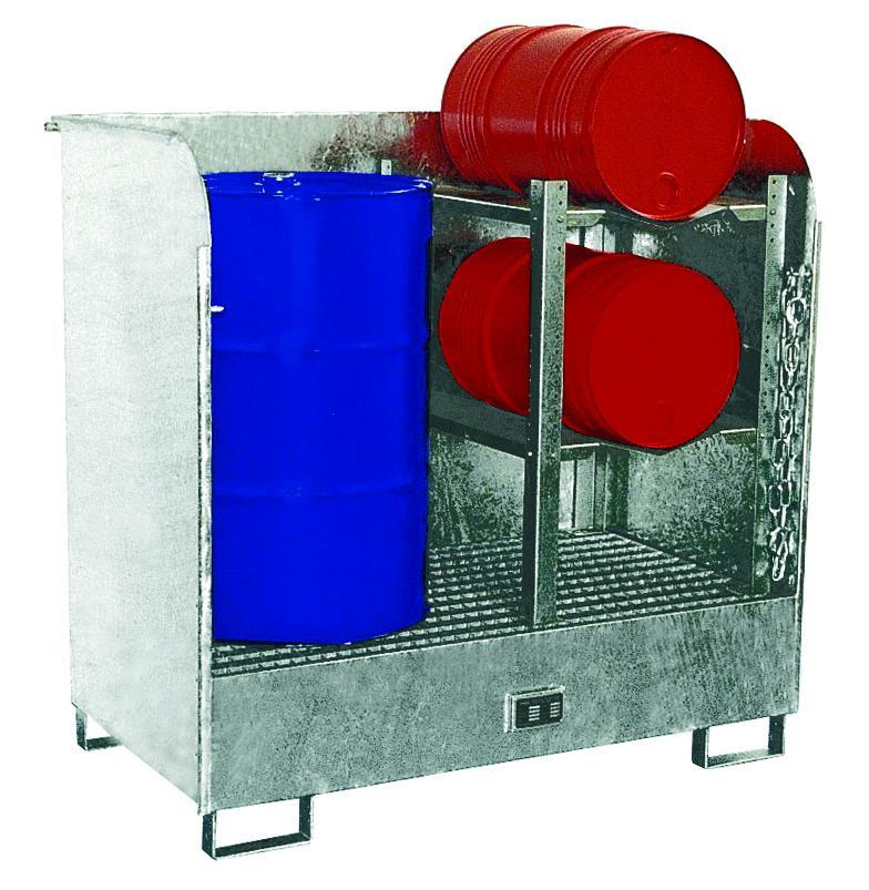 Voor binnen en buiten, voor 2 of 4 vaten van 200 liter, verzinkte rooster, dak met gasdrukveren, afsluitbaar, inrijpockets voor heftruck en 2 vleugeldeuren.
