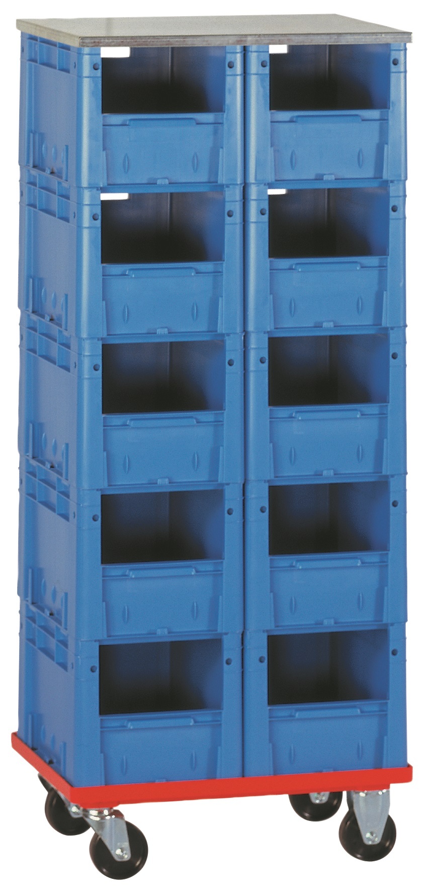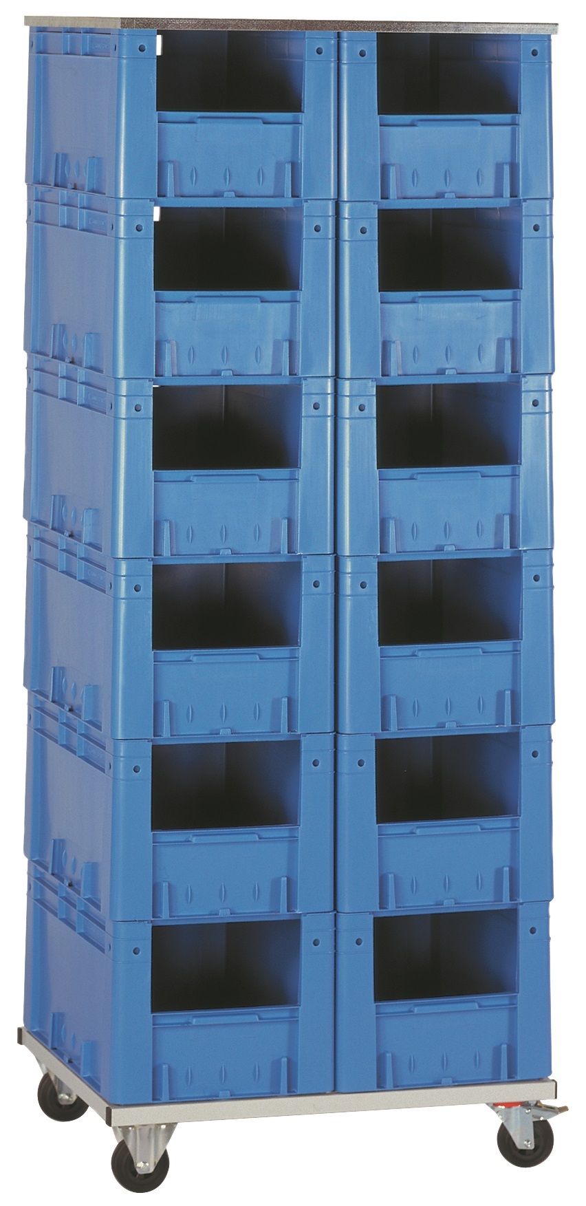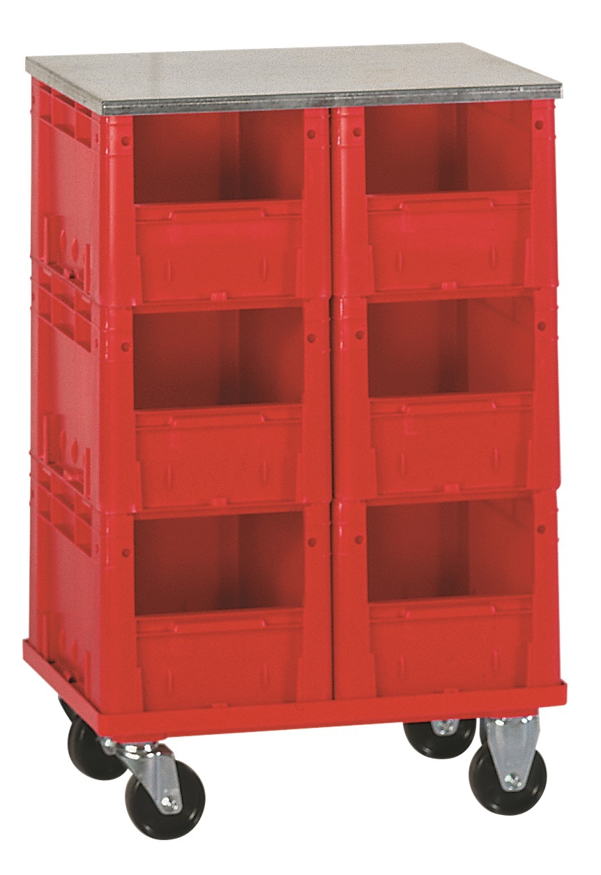 Verrijdbare  of  statische  stelling  voor  magazijnbakjes  van  het  type LKMVTK. Verschillende  opties en  opstellingen  mogelijk.