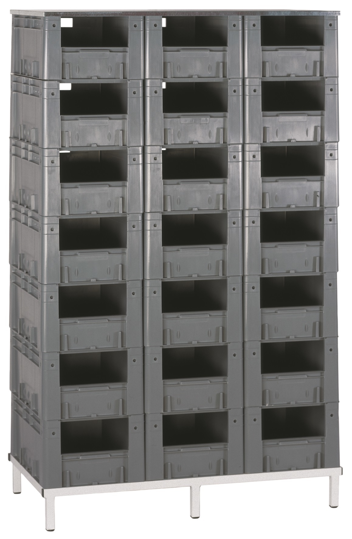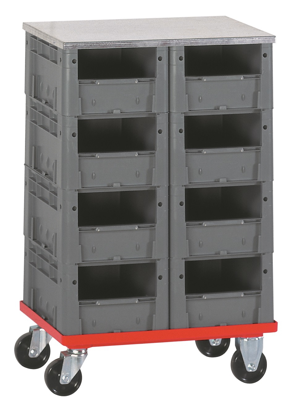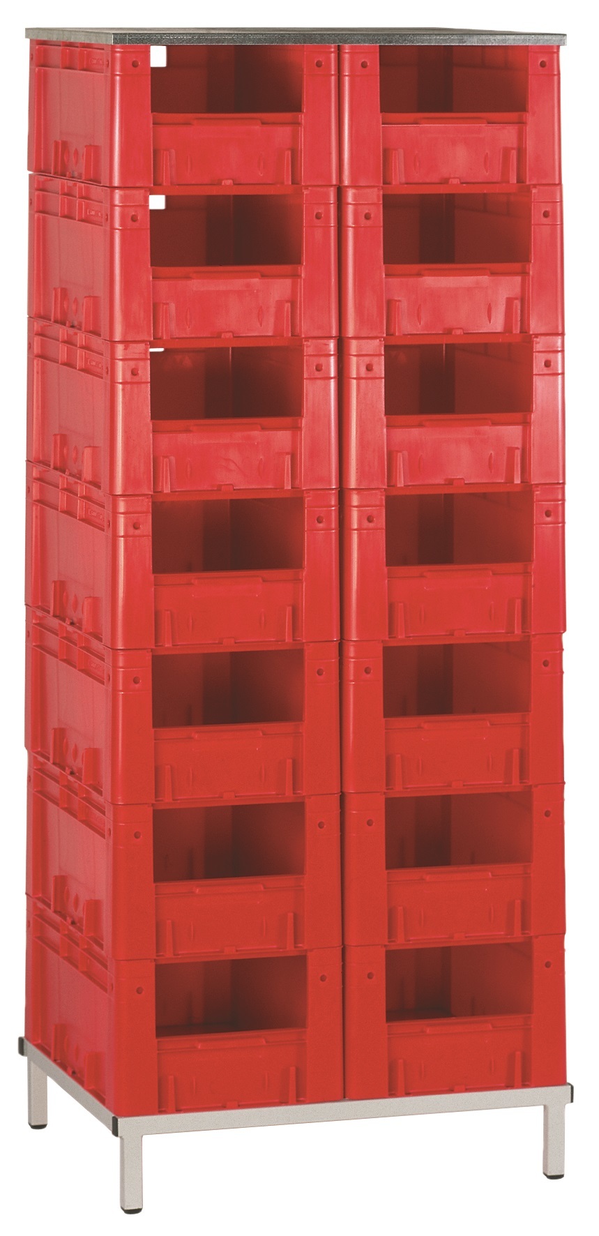 Verrijdbare  of  statische  stelling  voor  magazijnbakjes  van  het  type LKMVTK. Verschillende  opties en  opstellingen  mogelijk.