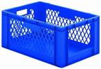 Transport stapelbakken uit polypropyleen. Voorzien van een grijpopening (265*172 mm). Verkrijgbar in rood, blauw en grijs. Geschikt voor levensmiddelen. Compatibel met EU pallet. Wanden geperforeerd.
