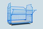 Uitvoering met voorwand voorzien van halfneerklapbare klep (in optie). Standaard ral 5012 blauw gelakt. Leverbaar met: etage, richting vastzetter, stellingsleden, dissel en koppeling, diverse wieltypes of stapelklauwen.