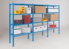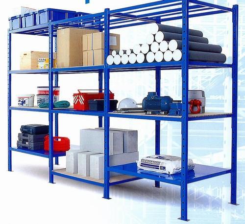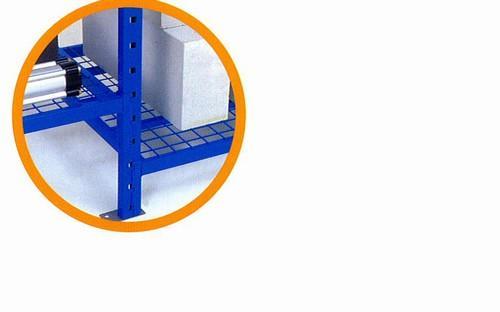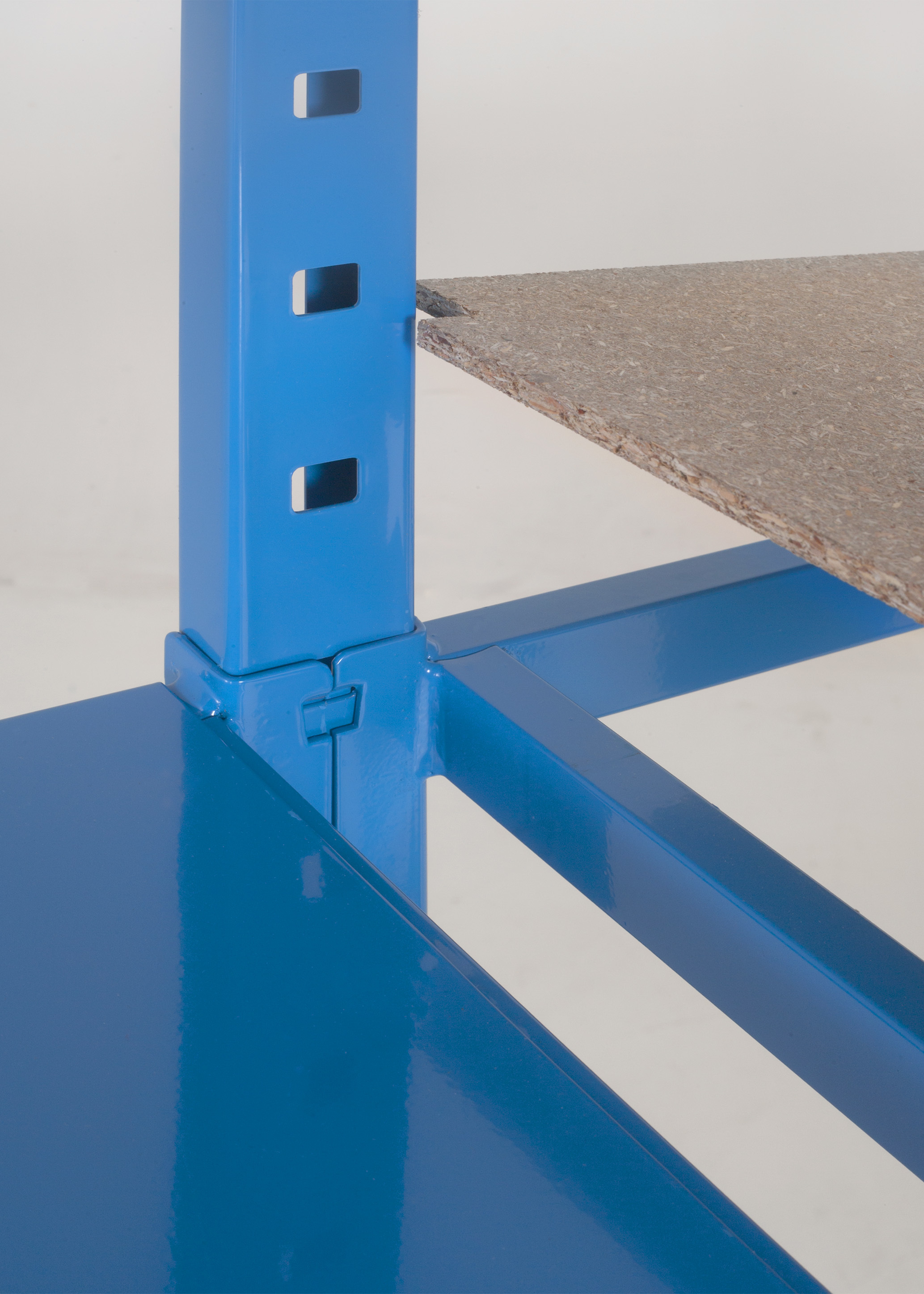 Buislegbord-stelling  voor  zware lasten. Staanders in C-profiel 50*30*15*1,5 mm,  perforatie om de 62,5 of 31,25 mm.  Toegelaten  draaglast tot 2000 kg. Afwerking in  Epoxy poeder coating RAL 5015 ,  blauw. Hoogte van  1000 mm tot 8000 mm in veelvouden  van  250 mm. Buislegborden uit één  stuk gelaste buizen sectie35*20 mm met 4 verbindingsstukken. Toegelaten draaglast tot 500 kg. Breedte  (750, 1010,1260 of 1510 mm), diepte ( 300,366,400,500,600,700,800,1000 of 1200 mm). Staalplaatlegborden met een  staalplaat van  0.8 mm,  gevouwen en  gelast  op een  buislegbord. Toegelaten  draaglast tot 500 kg. Gaslegborden met een  maaswijdte van  50*50 mm,  draad van  3,5 mm,  gelast  op een  buislegbord. Toegelaten draaglast tot 500 kg. Afdekplaten voor kleine niet  verpakte onderdelen. Hardboardplaat,  dikte 3 mm,  wit  gelakte hardboardplaat, dikte 3 mm,  gelakte of verzinkte staalplaat dikte 1 mm,  spaanplaat 8 mm aanbevolen  voor de  hoge draaglast.